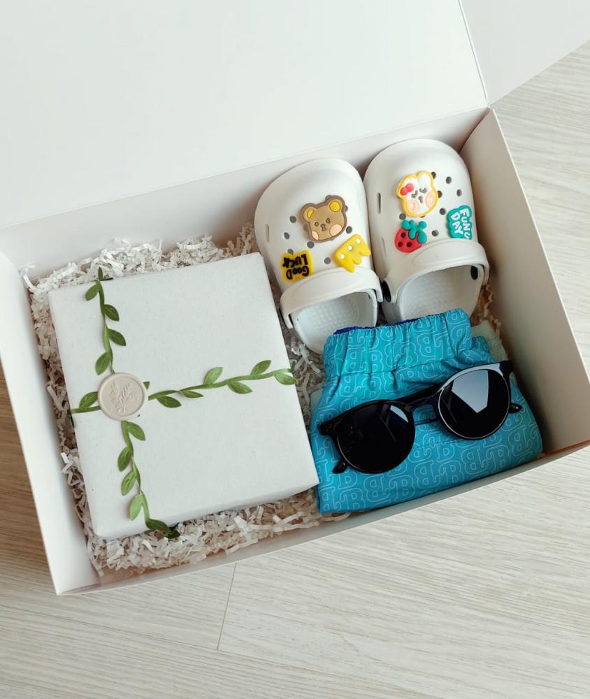 شورت سباحة ازرق من تيد بيكر عمر 12-18 شهر + شبشب بلاستيك + مسبح للأطفال + نظارة شمسية