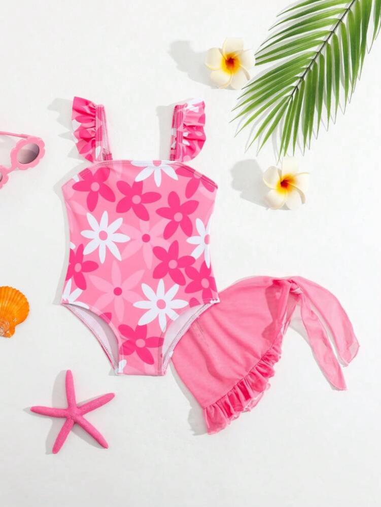 مايوه بنات زهري بورود زهريه مع قبعة بحر صيفية + شبشب بلاستيك زهري مناسب للأطفال + نظارات صيفية دائرية بورود بيضاء + مسبح مناسب للأطفال
