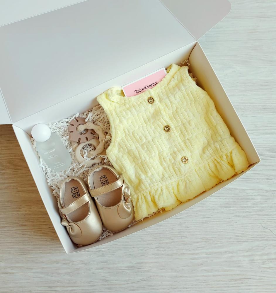 طقم أصفر مكون من قطعتين للبنات من جوسي كوتورعمر 6- 12 شهر + حذاء ذهبي + عطر أبيض + لعبة تسنين أطفال